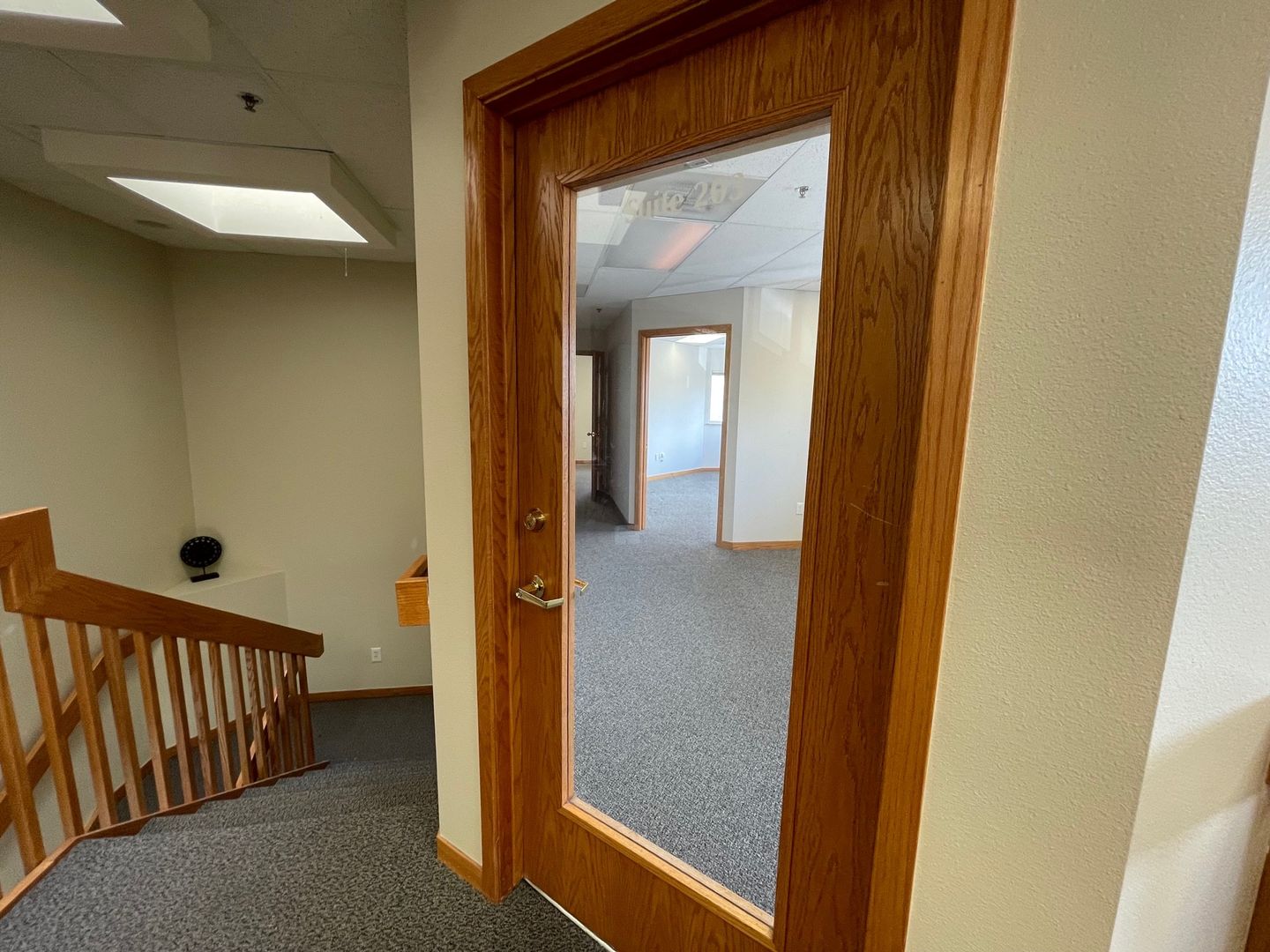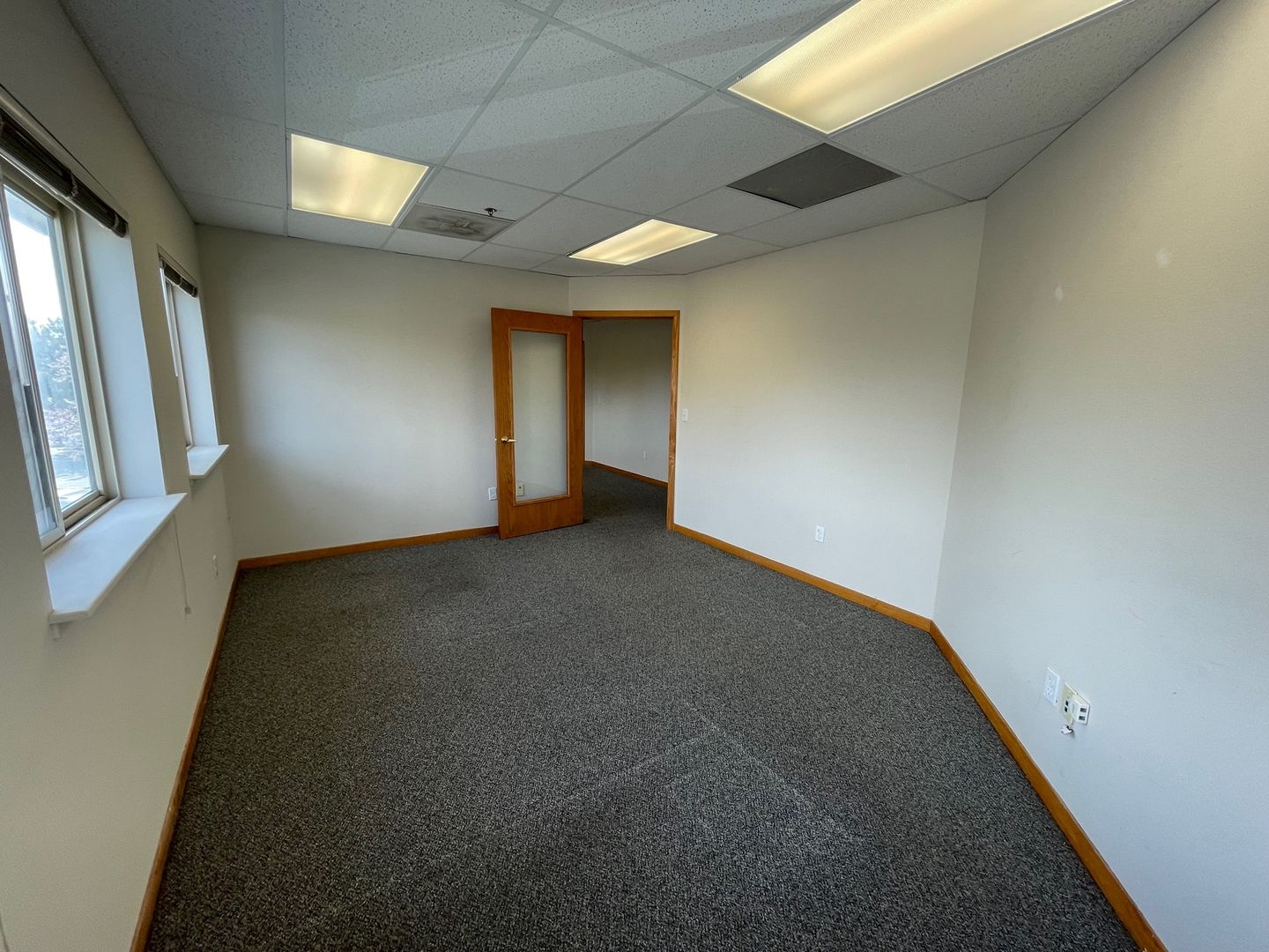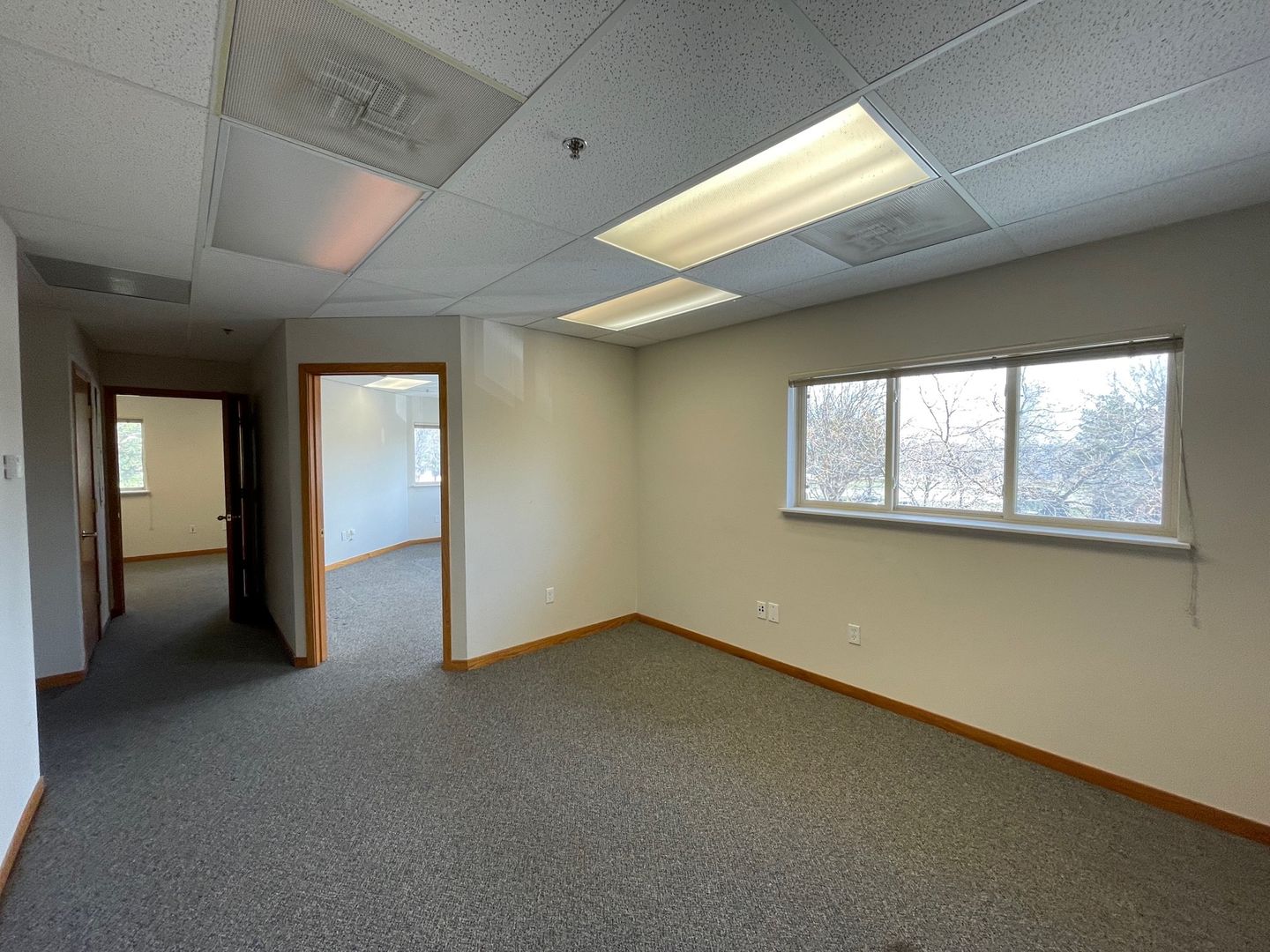 Suite #203 is a second-floor office space located in the heart of Forest Park Village. This north-facing office space features a front reception area, large private office or conference room, another second private office, and a kitchenette.