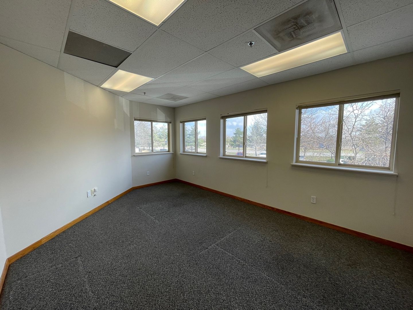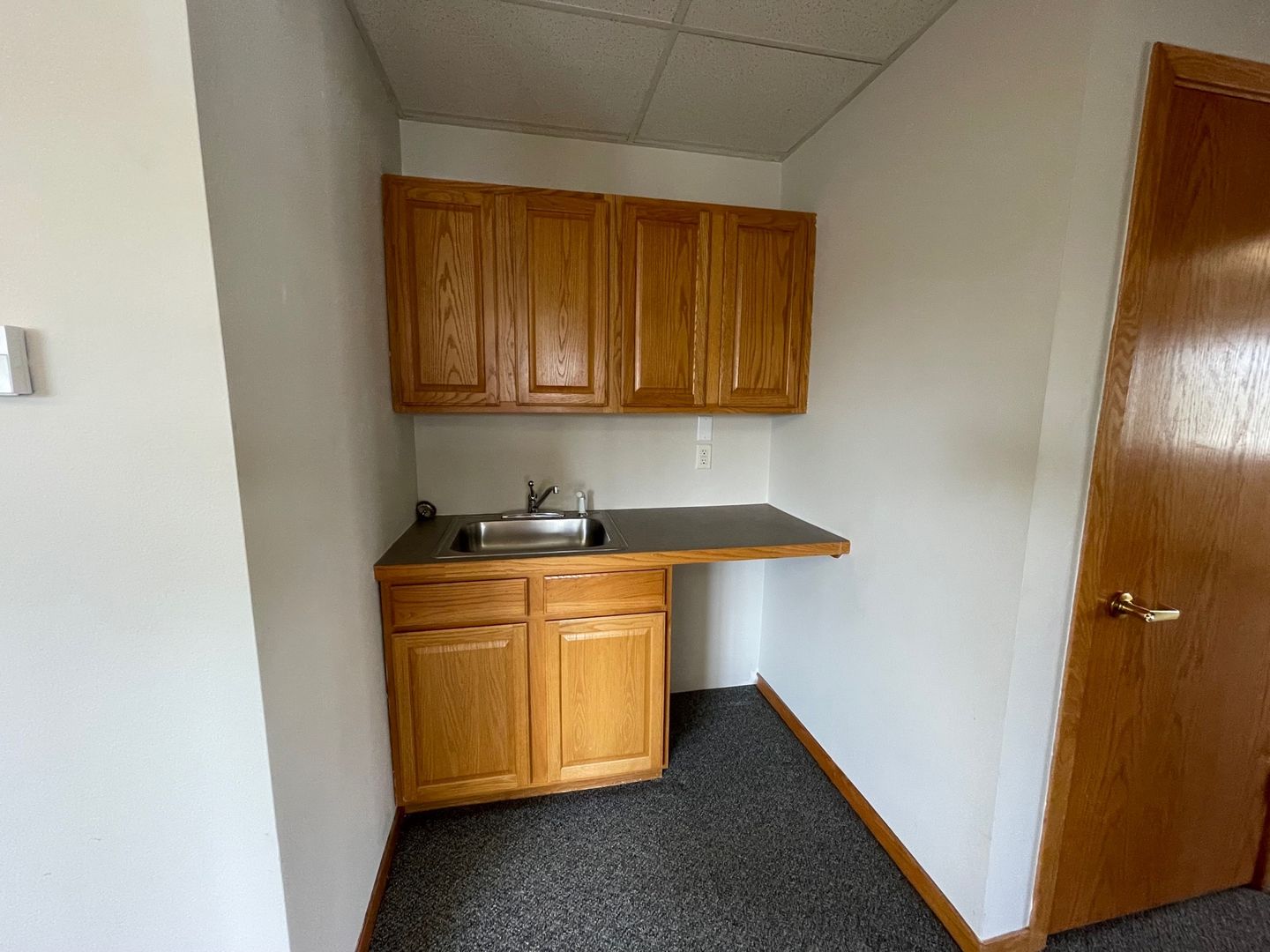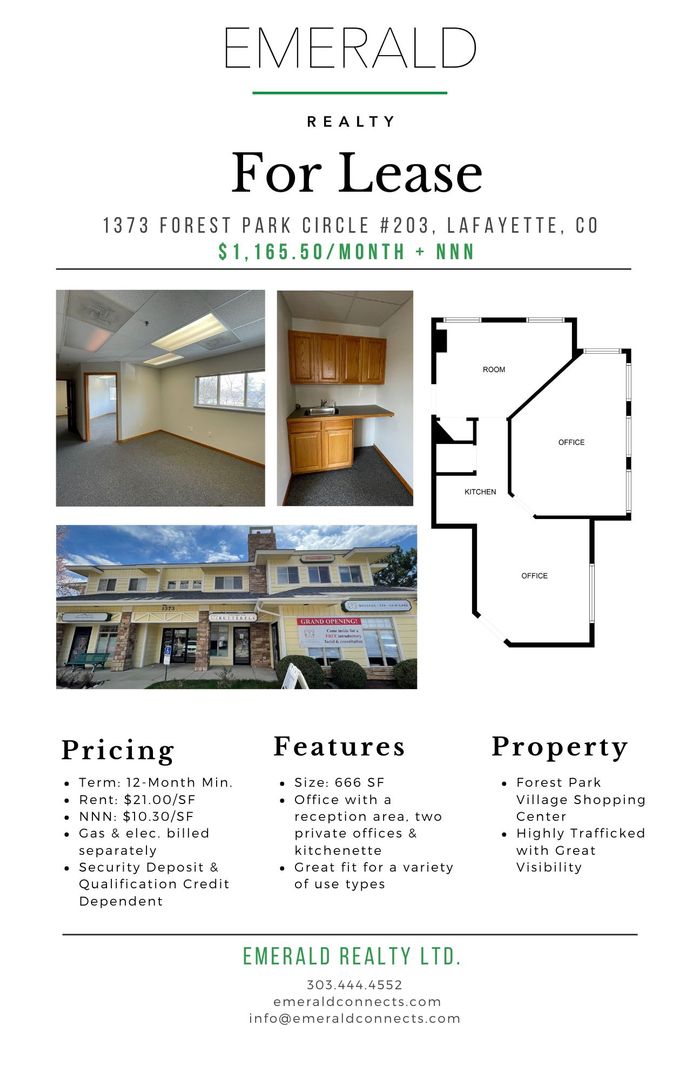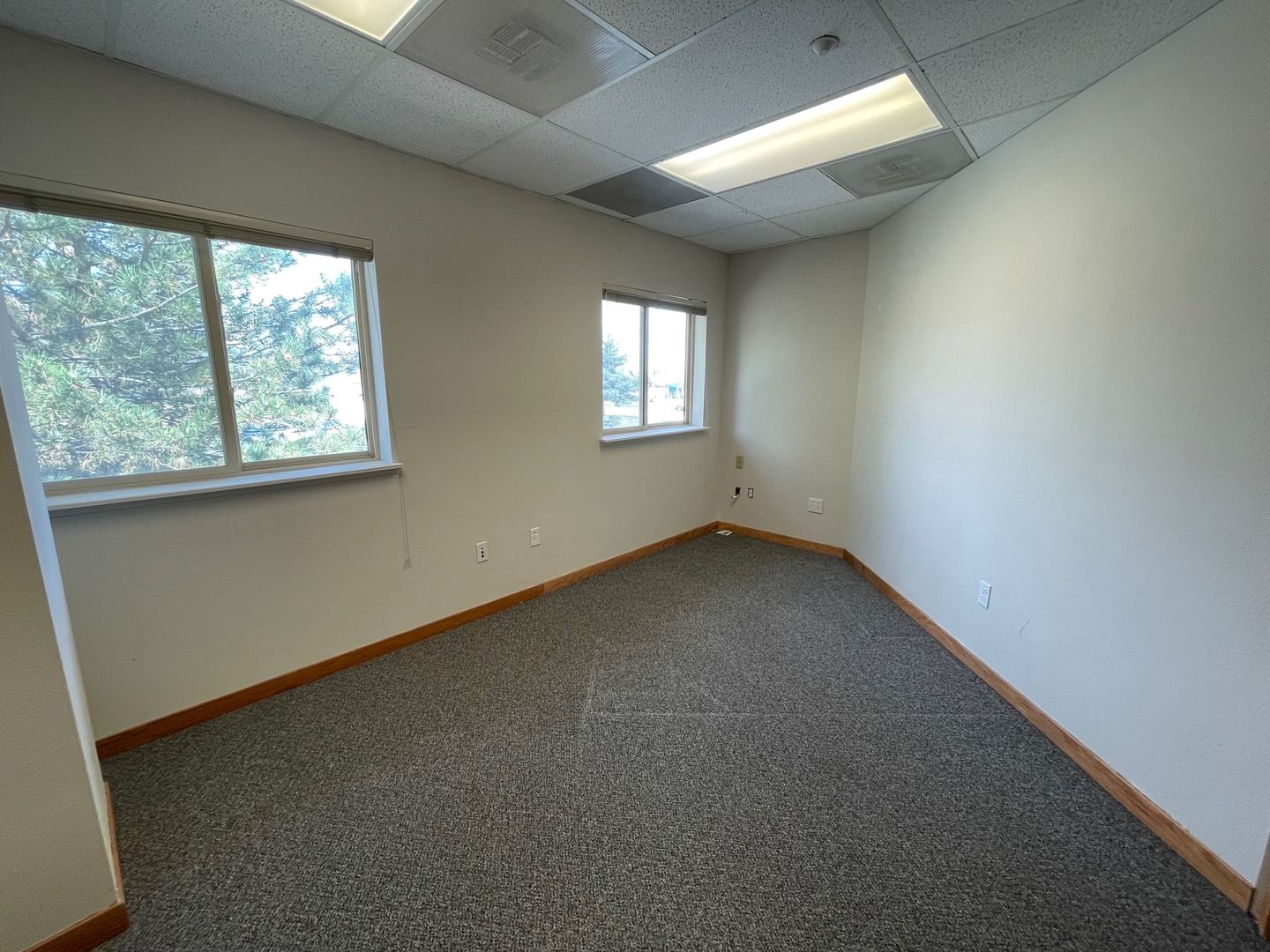 Suite #203 is a second-floor office space located in the heart of Forest Park Village. This north-facing office space features a front reception area, large private office or conference room, another second private office, and a kitchenette.